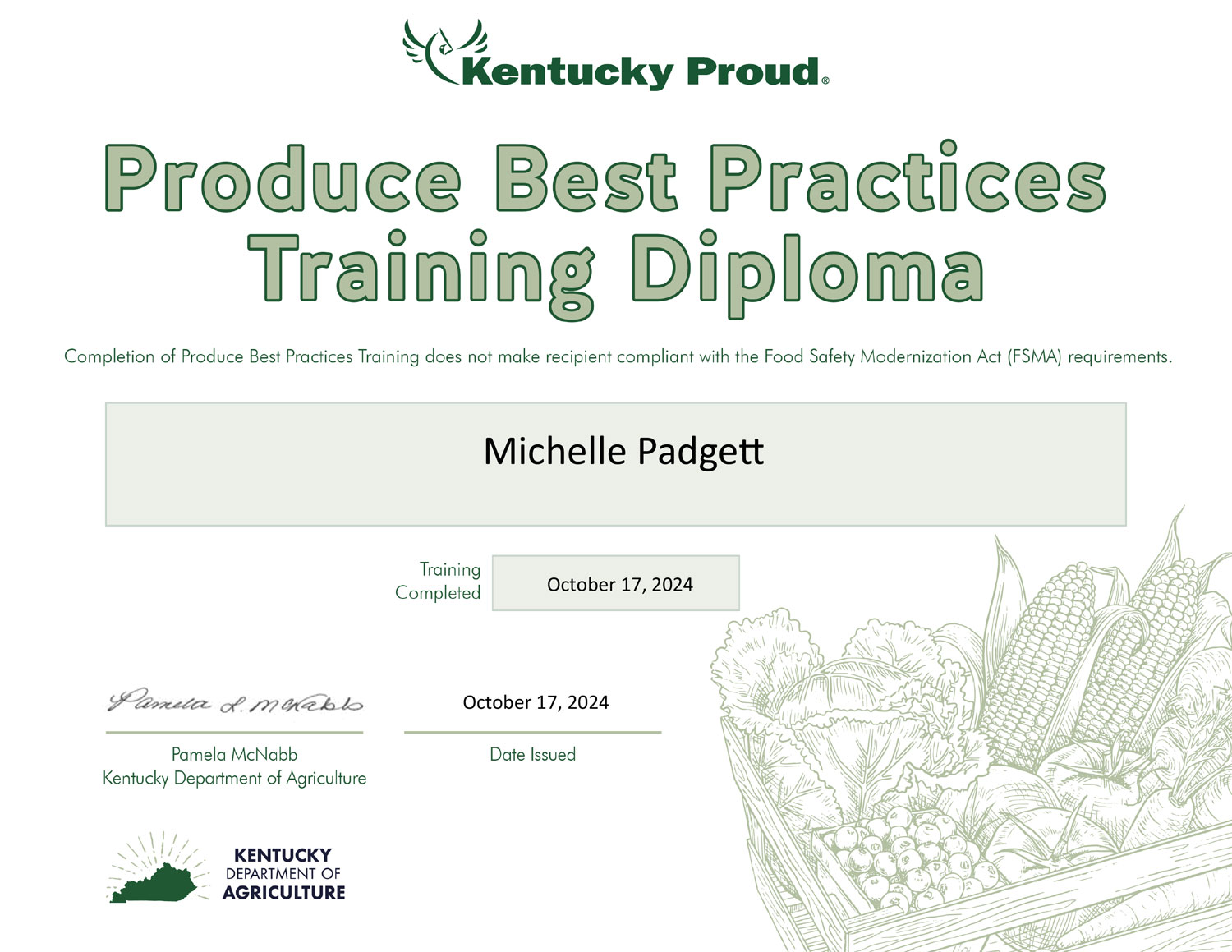 For growers with lower sales, we also participate in the Produce Best Practices Training (PBPT). This Kentucky-specific, voluntary training covers basic food safety and is designed to ensure all produce sold at Farmers Markets meets rigorous safety standards.