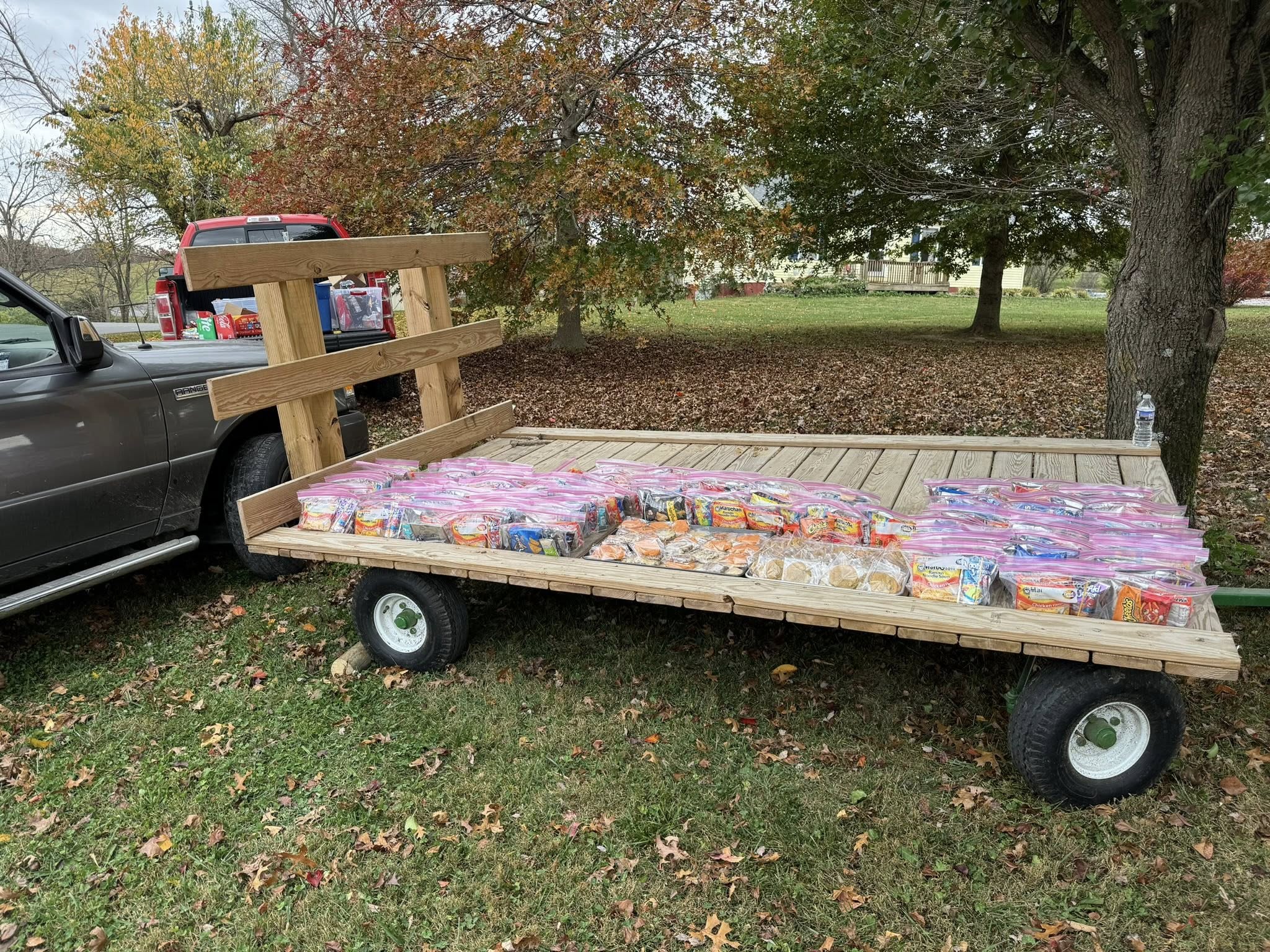 In our non-food bags, we have included a mini puzzle, mini bubbles, a cow Pop-It, and a straw—all farm-related items. We also added farm stickers to the bags. We had a lot of fun making these bags! Dad has made 500 bags with his signature ramen noodles and candy bars. We have 200 bags, my aunt and uncle have 250 bags of candy, and then we have 50 non-food bags.